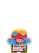 Features: Human-like teeth, mismatched button eyes, tongue hanging out, clingers, holding a sign