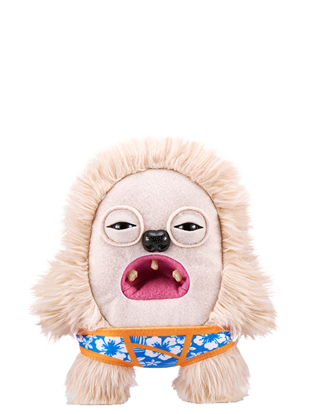 Features: Three human-like teeth, slitted eyes, black nose, rounded body