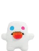 Features: Human-like teeth, mismatched button eyes, rainbow furry tongue hanging out